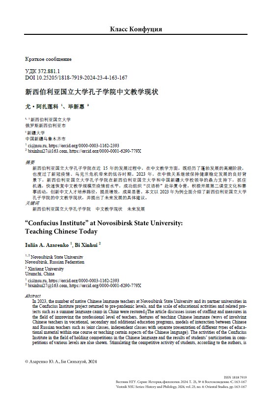 Creators Азаренко Юлия Анатольевна; Би Синьхуэй (доцент) Organization Новосибирский государственный университет Imprint Новосибирск: Издательско-полиграфический центр НГУ, 2024 Collection Статьи штатных преподавателей НГУ Subjects Труды штатных преподавателей НГУ; Институт Конфуция; Новосибирский государственный университет; Преподавание китайского языка UDC 372.881.1 LBC 74.58 Document type Article, report Language Russian DOI 10.25205/1818-7919-2024-23-4-163-167 Rights Свободный доступ из сети Интернет (чтение, цитирование) Record key RU\NSU\analitnsu\2693 pdf, 367 Kb -